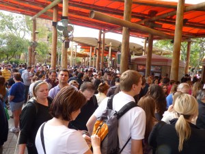 The park opened at 9:30. We got there a little after 10:00 on January 4, figuring the lines wouldn’t be too bad since the kids were supposed to be back at school the day before. We were a little naive. Here’s a picture of the excited, happy people waiting to get into the park.