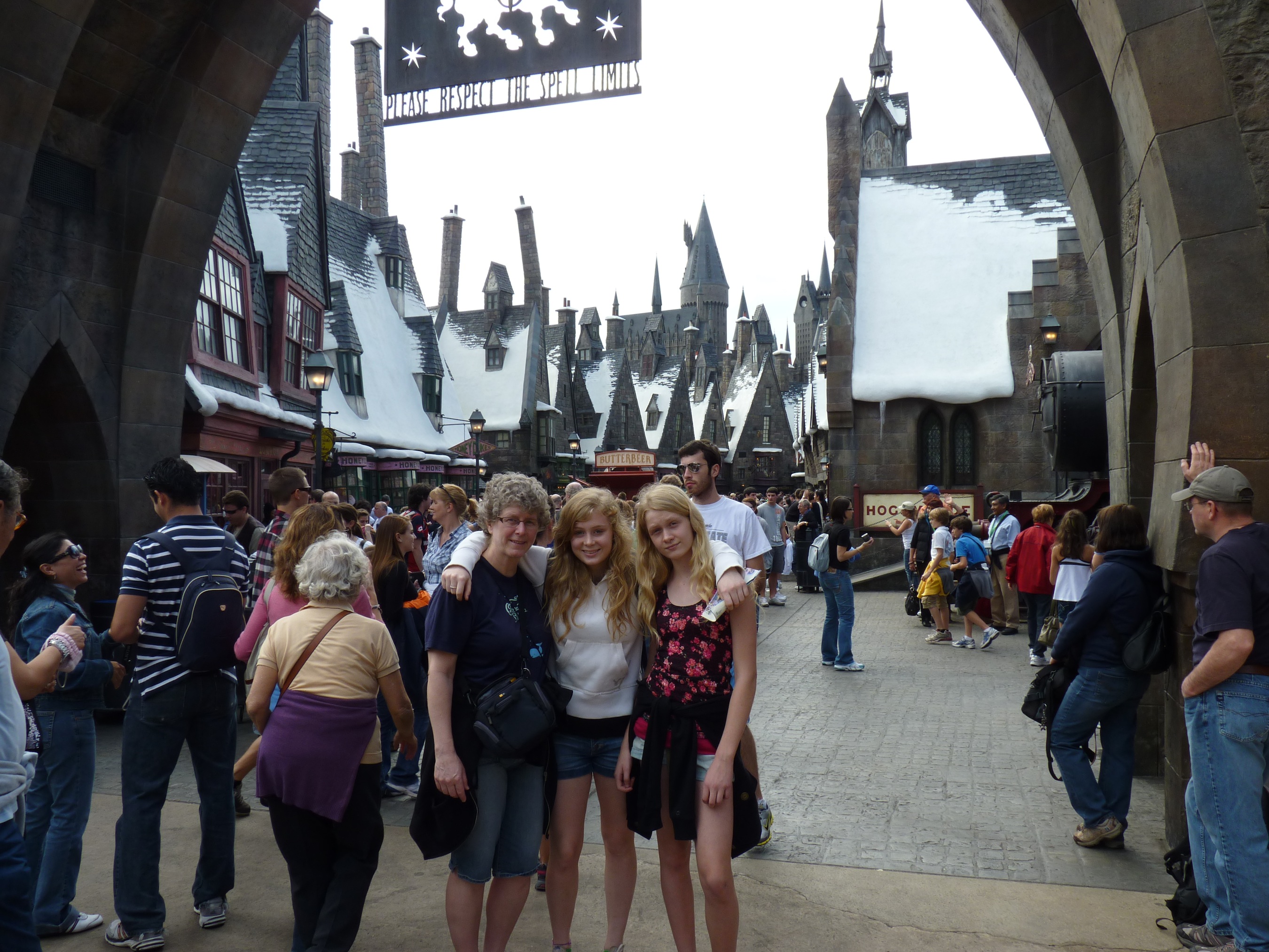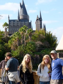 It only took us about an hour to get into the park and I felt confident that we’d have time to go on all the rides we wanted. But just in case, we decided to visit the Harry Potter section, first. Below is a picture of some of us with the castle in the background. Who knew there would be palm trees at Hogwarts!