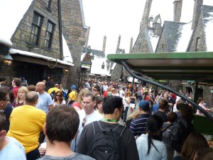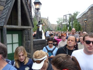 We wanted to visit Honeydukes, Zonkos, Dervish and Banges, Olivanders, etc., but each store had a wait of 20 minutes or more to get inside. Yes, you had to wait in line to look at things you might want to buy, and then you had to wait in line to buy them. Tom began to mutter words like “insane”, “appalling”, and “obscene” over and over under his breath and there was a wild, trapped-animal look around his eyes. So we decided to bypass the stores and do the “Harry and the Forbidden Journey” ride, and then head to more mundane sections of the park.
