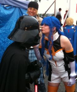 That’s funny–I thought the same thing. The helmet is a little over-sized. Though Darth was kneeling so the girl could reach him for the kiss…